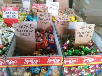 Відзначимо, що на фото зображений торговий прилавок, на якому покупцям пропонуються цукерки з назвами "Тесляр Вася", "Кочегар Петя", "Гламурний відпочинок", "Заводна теща". Ціни на цукерки варіюються в межах 409-485 руб/кг (162-192 грн/кг).