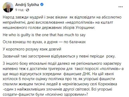 "Народ завжди мудрий і знає віками як відповідати на абсолютно неприйнятні, дикі висловлювання "недополітиків" на кшталт нешановного голови державних зборів Угорщини: He who is guilty is the one that has much to say. Осла взнаєш по вухах, а дурня — по балачках. У короткого розуму язик довгий. Зазвичай такі загострення відбуваються у певні періоди року, - наголосив Андрій Сибіга.