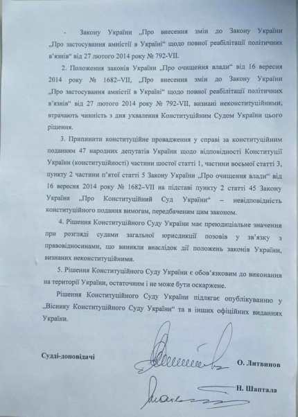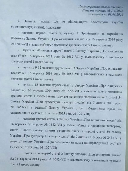 "За даними, які мені передали кілька порядних людей в Конституційному суді, вони скасують основні положення закону про очищення влади (закон про люстрацію - Ред.), дозволять найближчому оточенню Януковича знову обійняти посади в уряді, Адміністрації президента, повернутися сотням прокурорів, керівників податкової міліції часів Януковича, які були змушені піти з цих постів внаслідок дії закону про очищення влади", - сказав депутат.