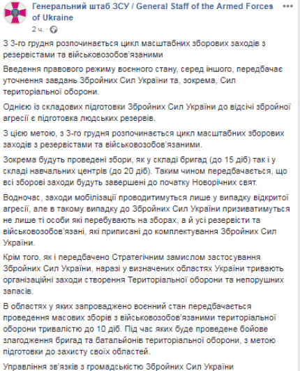 "В областях, в яких введено воєнний стан, передбачається проведення масових зборів з військовозобов'язаними територіальної оборони тривалістю до 10 діб. Під час зборів буде проведено бойове налагодження бригад і батальйонів територіальної оборони, з метою підготовки до захисту своїх областей", - додали в Генштабі ЗСУ .