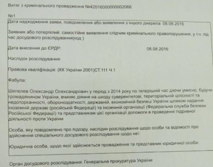 "На підставі отриманих процесуальним шляхом документів і доказів Головною військовою прокуратурою (за дорученням Генерального прокурора України) відносно Шепелєва зареєстровано кримінальне провадження за ч.1 ст.111" державна зрада", - зазначив Матіос.