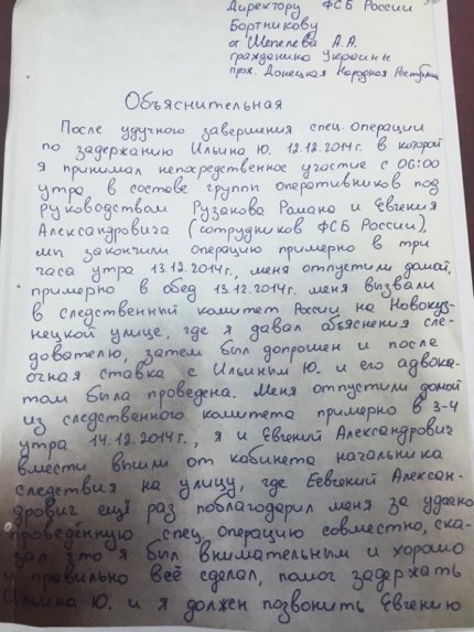 Також військовий прокурор надав копію заяви Шепелєва про згоду служити ФСБ РФ.