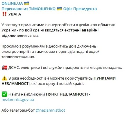 У зв’язку з прильотами в енергооб’єкти в декількох областях України - по всій країні вводяться аварійні відключення світла. Просимо з розумінням відноситись до відключень електроенергії та тимчсових перепадів подачі водо/теплопостачання, - написав представник ОПУ.