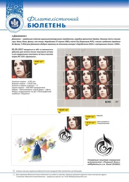 Українське державне підприємство поштового зв'язку "Укрпошта" випустило марку з зображенням переможниці тогорічного Євробачення Джамали.