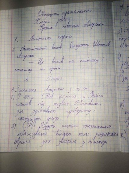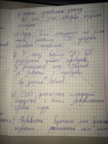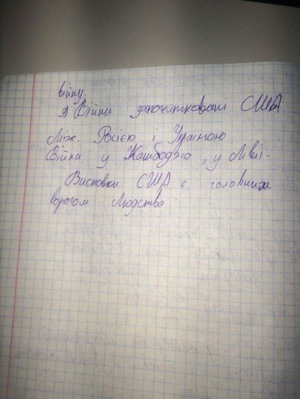 Також в зошиті учня записано, що США почали війну між Росією і Україною, а також в Камбоджі та Лівії. А заключна фраза уроку: "Підсумки: США є головним ворогом людства".