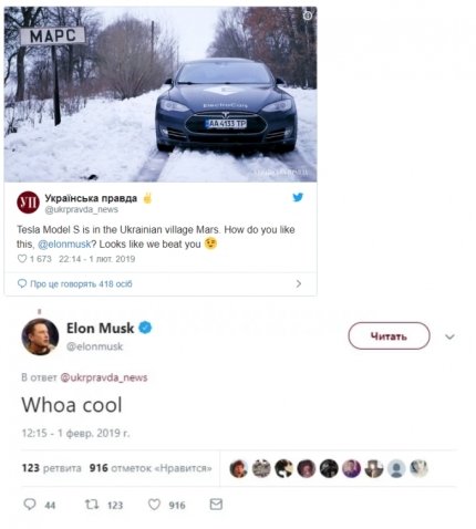 Українські журналісти спільно з компанією Electrocars привезли автомобіль Tesla Model S в село Марс у Чернігівській області. Вони одразу зробили фото Tesla у Марсі та розмістили у Twitter, а також відзначили Ілона Маска.