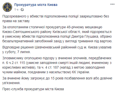 Нагадаємо, співробітника Національної поліції України, підполковника Дмитра Глушакова застрелили 5 липня в Шевченківському районі Києва. Вбивство правоохоронця було скоєно з метою пограбування. Злочинець, який неодноразово був судимий за тяжкі злочини, через Інтернет знайшов об'яву Глушакова про продаж золотого ланцюжка. Він домовився з продавцем про зустріч, але сівши в машину до Глушакова, зробив два постріли з пістолета, викрав золотий ланцюжок, про продаж якого йшлося, і мобільний телефон правоохоронця, після чого зник з місця злочину.