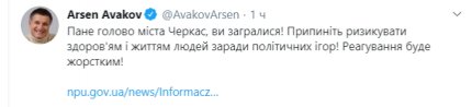 "Пане голово міста Черкас, ви загралися! Припиніть ризикувати здоров'ям і життям людей заради політичних ігор! Реагування буде жорстким", - написав Аваков.