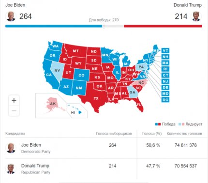 Результати голосування ще не ясні в Арізоні, Неваді і Джорджії. Якщо Байден там виграє, то отримає необхідні 270 голосів для перемоги на виборах в США. Трамп потенційно виграє 3 голоси від Аляски і 15 від Північної Кароліни. Якщо він здобуде перемогу тільки в цих штатах, то до перемоги на виборах президента США йому не вистачатиме більше 30 голосів вибірників.