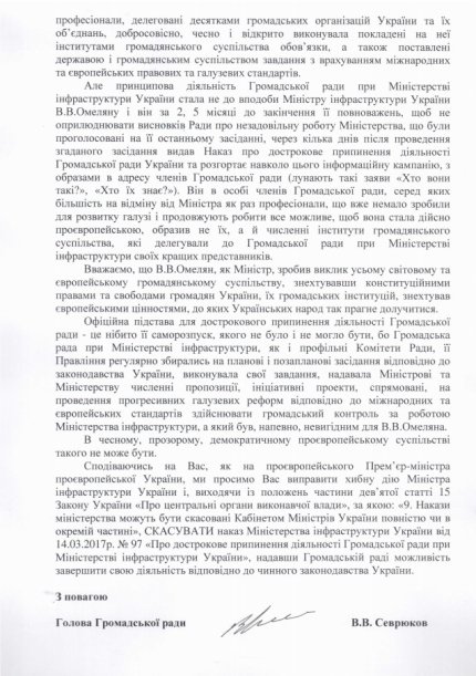 Як повідомляється, автори звернення наголошують, що Омелян протизаконно достроково 14 березня 2017 ліквідував Громадську раду при Міністерстві інфраструктури України, яка за кілька днів до того визнала роботу Міністерства незадовільною.