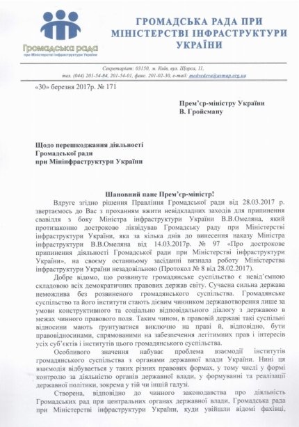 Про це йдеться в зверненні Громадської ради при Мінінфраструктури до глави уряду, яке цитує УНН.