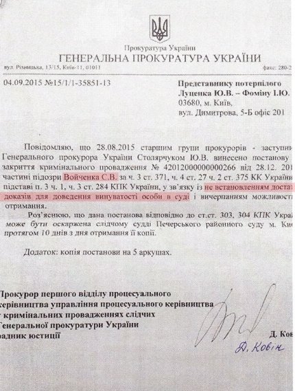 Він також доклав копію відповіді Генпрокуратури на відповідний запит Луценка від вересня 2015 року.