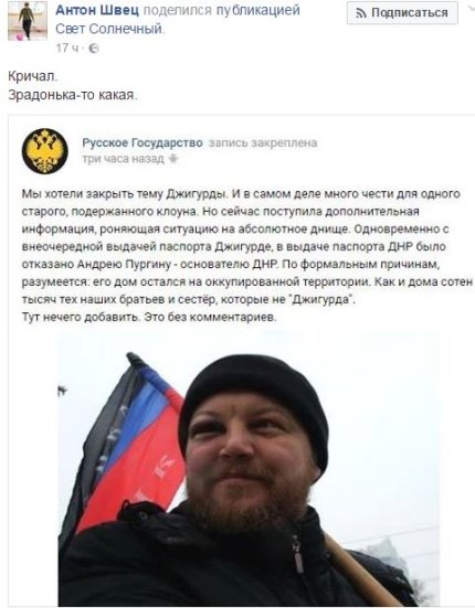 "Кричав. Зрадонька-то яка", - написав Швець і надав скріншот сепаратистської спільноти "Російська держава", яка повідомляє, що "засновнику ДНР" Андрію Пургіну відмовилися видати "документ ДНР".