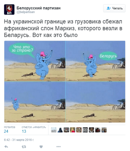 "Слон, який втік з білоруської вантажівки, просить політичного притулку у всіх зоопарків України", - сміється Сірий Кардинал.