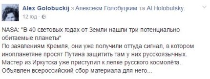 "За заявами Кремля, вони вже отримали звідти сигнал, в якому інопланетяни просять Путіна захистити там у них російськомовних. Майстер з Іркутська вже приступив до ліплення російського космолета. Оголошено всеросійський збір матеріалу для нього...", - пожартував Голобуцький.