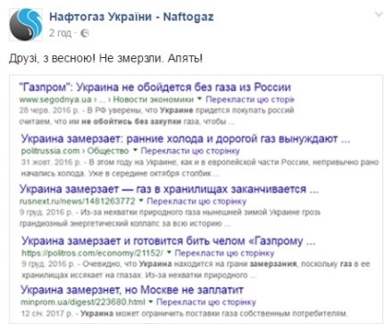 На сторінці компанії "Нафтогаз України" в соцмережі привітали українців з приходом весни, виставивши скріншоти новинних стрічок з повідомленнями початку зими 2016-17.