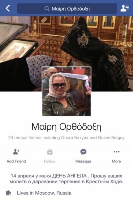 "Знайте її в обличчя - Марія Ципко. Вона ж Олена Фом - Марія Погодіна - Марія Бавикіна - Марія Православна тощо. Нам вона представилася як заступник директора Благодійного Фонду новомучеників і сповідників Христових. Зараз вона, прикриваючись моїм ім'ям, отримує гуманітарні вантажі у різних спонсорів і організацій, у парафій і єпархій та відправляє невідомо куди. Є серйозні підстави вважати, що частину цієї допомоги вона просто привласнює, адже вантаж жодного разу не дійшов до одержувачів в 100-процентному обсязі", - написала актриса.