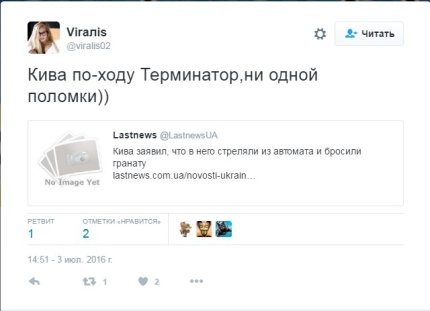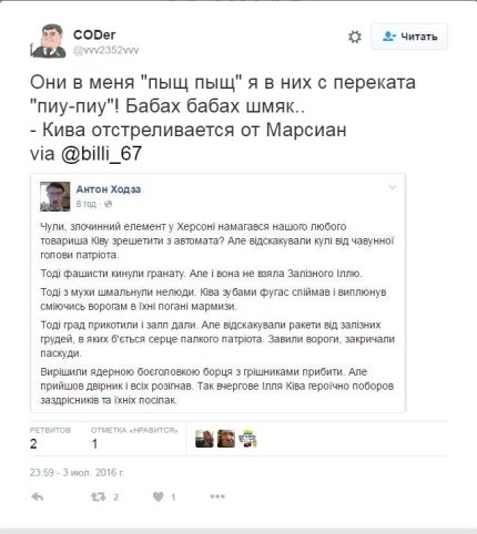 Так блогер Антон Ходза на своїй сторінці в Facebok написав: "Чули, злочинний елемент в Херсоні намагався нашого дорогого товариша Ківу зрешетити з автомата? Але відскакували кулі від чавунної голови патріота. Тоді фашисти кинули гранату. Але і вона не взяла Залізного Іллю. Тоді з "мухи" шмальнули нелюди. Ківа зубами фугас зловив і виплюнув, сміючись ворогам в їх погані фізіономії".