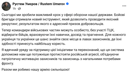 Бригади отримали інструменти, про які вже давно просили, — проводити якісний рекрутинг, результатом якого є адресний призов добровольців. Ця постанова є інструментом, що дозволяє суттєво зменшити час рекрутингу й гарантує, що кожен та кожна зможе долучитися туди, де його чи її бажання та вміння збігаються з потребами оборони.
