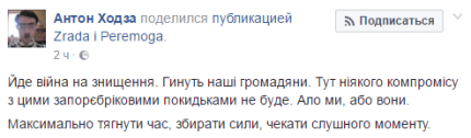 "Йде війна на знищення. Гинуть наші громадяни. Тут ніякого компромісу з цими запоребриковими покидьками не буде. Або ми, або вони. Максимально тягнути час, збирати сили, чекати слушного моменту", - написав у Facebook Антон Ходза.