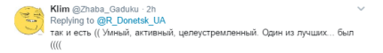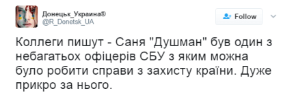 "Колеги пишуть - Саня "Душман" був один з небагатьох офіцерів СБУ з яким можна було робити справи з захисту країни. Дуже прикро за нього", - йдеться в повідомленні користувача Донецьк_Украіна в Twitter.