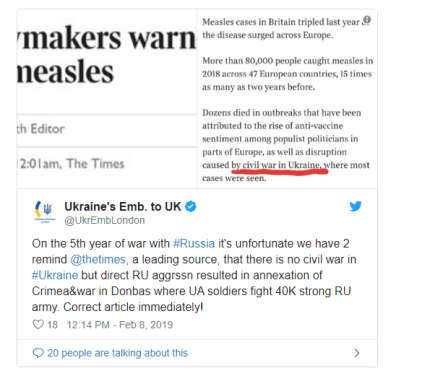Зазначається, що українська дипломатка Наталія Галібаренко також направила відповідного листа автору статті, редактору розділу "Здоров'я" Крісу Сміту. Стаття із некоректною фразою вийшла на сайті The Times 8 лютого. Вона присвячена темі стрімкого розповсюдженні кору в Європі.