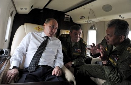 Военно-политическое руководство России (президент РФ Владимир Путин, министр обороны Сергей Шойгу и начальник Генштаба РФ Валерий Герасимов) управляет войсками на Донбассе через Южный военный округ