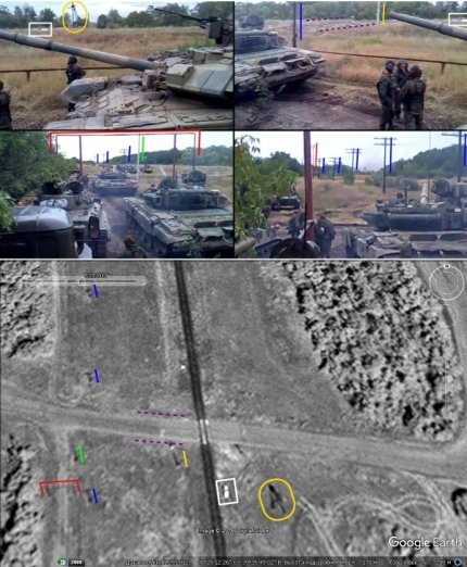 Askai707 ранее зарегистрировал в этом районе присутствие российских военнослужащих из 136-й мотострелковой бригады. Эта же бригада управляет и танками Т-90А. Как InformNapalm, так и Askai707 установили, что танки этой бригады действовали в восточной части Украины летом 2014 года. На снимках также показаны танки Т-90А, однако на снимках с географической привязкой показаны только части танка или тыльная их сторона на открытой дороге. Изображения с отмеченной геолокацией показаны ниже: