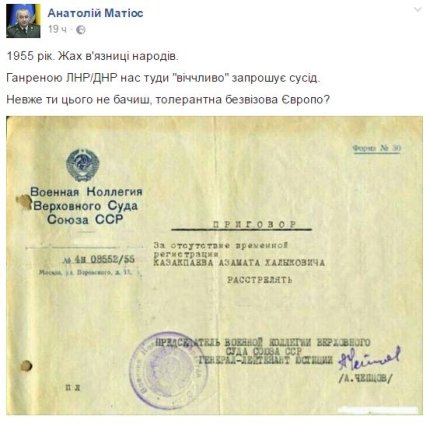 "1955. Жах тюрми народів. Ганреною ЛНР / ДНР нас туди "ввічливо" запрошує сусід. Невже ти цього не бачиш, толерантна безвізова Європа?" - написав військовий прокурор, додавши фейковий документ.