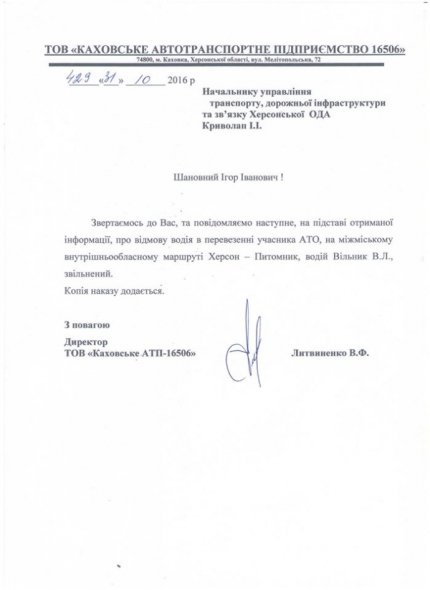 "А ось і реакція на публікацію про відмову водія на безкоштовне перевезення військовослужбовця - учасника бойових дій 14 жовтня. Спасибі за реагування департаменту транспорту, дорожньої інфраструктури і зв'язку Херсонської ОДА та керівництва ТОВ «Каховське АТП» 16506», - написала вона.
