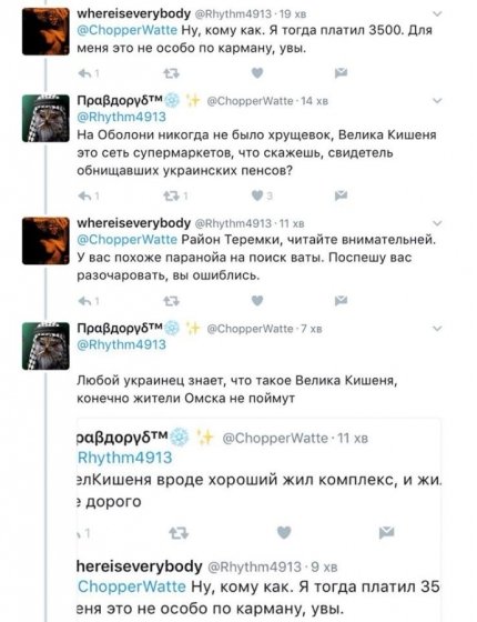 Так, в ході листування троль назвав мережу магазинів "Велика кишеня" житловим комплексом і зізнався, що платив за проживання там 3500 гривень на місяць.
