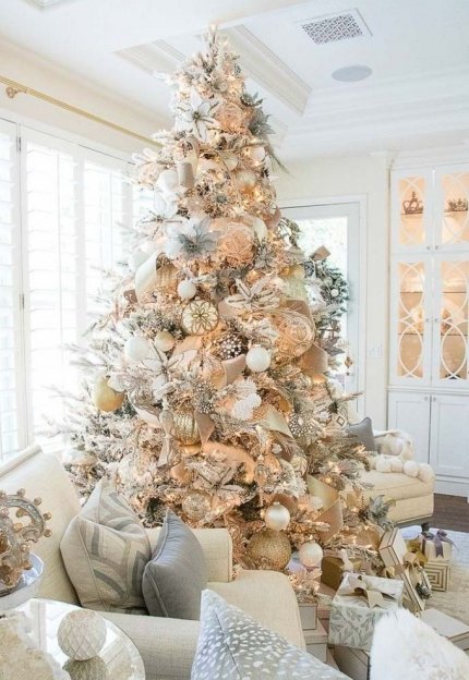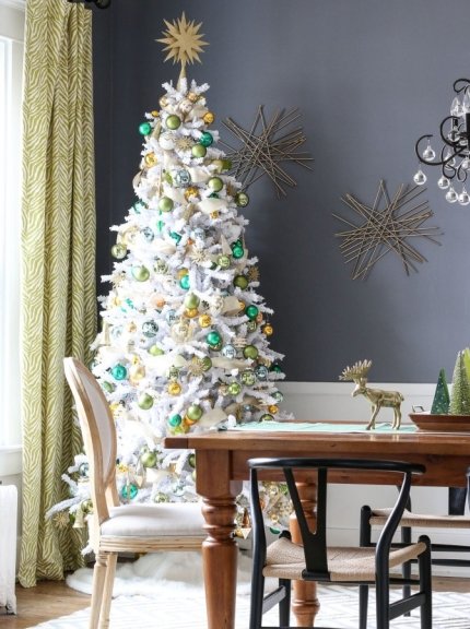 Для модних скандинавських та мінімалістичних інтер'єрів для прикраси ялинки більше підійде білий колір. Підберіть іграшки білого і перламутрового відтінків, додайте до них сріблястої мішури - в такому обрамленні ялинка немов засяє в морозному інеї.