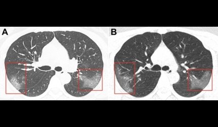 При цьому демонструються два знімка легенів пацієнтки. На першому показані множинні помутніння, що створюють ефект матового скла. Другий знімок був зроблений три дні потому. Він показує, що хвороба прогресує, а область "матового скла" розширюється. Який стан пацієнтки на даний момент, в публікації не вказано.
