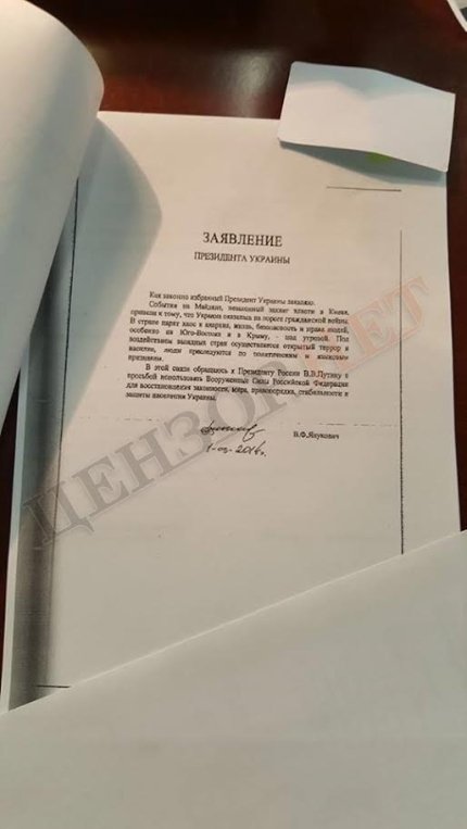 "У зв'язку з цим звертаюся до Президента Росії Ст. Ст. Путіну з проханням використовувати Збройні сили Російської Федерації для відновлення законності, миру, правопорядку, стабільності і захисту населення України", - наголошується в документі, на якому стоїть підпис Януковича.