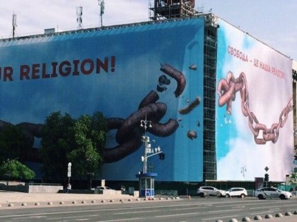 Медіа-центр також встановив гігантський банер «СВОБОДА - ЦЕ НАША РЕЛІГІЯ» на Майдані Незалежності, на місці драматичної боротьби українського народу за незалежність під час Революції Гідності 2014 року.