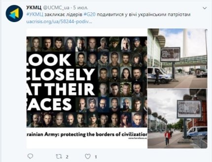 Під час саміту G20 7-8 липня в Гамбурзі УКМЦ встановив великий рекламний щит в 10 метрах від офіційного входу на саміт, щоб нагадати світовим лідерам про війну на сході України. На щиті були зображені героїчні обличчя бійців АТО, добровольців і медиків України, які захищають країну від російської агресії.