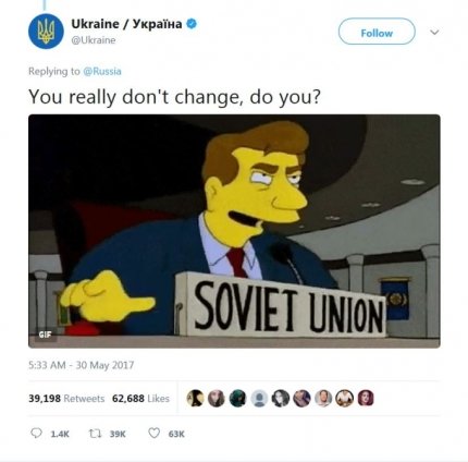 Через п'ять годин російське МЗС відповіло твітом про спільну історію Білорусі, Росії та України. Це виглядало як радянська пропаганда, тому медіа-центр розмістив анімаційну GIF-картинку з мультика про «Сімпсонів», де російський посол в ООН змінює паспортну табличку Росії на табличку Радянського Союзу.