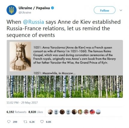 Коли Путін 29 травня в Парижі стверджував, що Анна Ярославна (також відома як Анна Київська) встановила відносини між Росією і Францією, медіа-центр запустив офіційний акаунт Twitter @ України, і відповів гумором на заяву Путіна: «Коли Анна стала королевою Франції, в Росії був тільки нескінченний березовий гай».