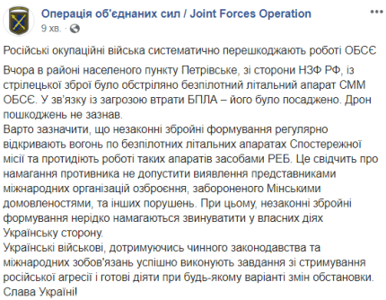 Командування ООС уточнило, що противник не в перший раз стріляє по беспилотникам ОБСЄ і всіляко протидіє роботі таких апаратів за допомогою засобів радіоелектронної боротьби. У штабі наголосили, що українські військові при цьому дотримуються законодавства і міжнародних зобов'язань і здатні стримувати російську агресію при будь-якому варіанті змін обстановки.