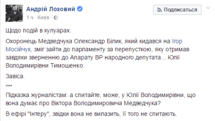 Інший нардеп Радикальної партії Андрій Лозовий в Facebook повідомив, що перепустку до Верховної Ради для помічника Медведчука замовляла особисто лідер фракції "Батьківщина" Юлія Тимошенко.
