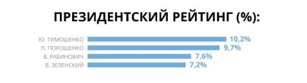 Що ж стосується виборів президента України, найбільшу кількість голосів в першому турі отримають лідер «Батьківщини» Юлія Тимошенко (10,2%) і нинішній глава держави Петро Порошенко (9,7%), а також лідер партії «За життя» Вадим Рабинович ( 7,6%) і новачок політичних рейтингів - лідер партії «Слуга народу» Володимир Зеленський (7,2%).