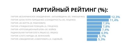 Так, якби парламентські вибори проходили в найближчу неділю, до нового складу вищого законодавчого органу країни пройшли б вісім політичних партій. Найбільшу кількість голосів українських виборців отримала б партія «Батьківщина» на чолі з Юлією Тимошенко (12,3%) і партія «Блок Петра Порошенка - «Солідарність »(11,4%). За ними слідують партія «За життя» Вадима Рабиновича (7,9%), «Громадянська позиція» Анатолія Гриценка (7,8%), «Опозиційний блок» Юрія Бойка (7,4%), Радикальна партія Олега Ляшка (6, 9%), новий політичний проект «Слуга народу» телезірки Володимира Зеленського (5,7%) і Об'єднання «Самопоміч» Андрія Садового (5,3%).