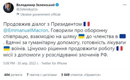 30 квітня український лідер Володимир Зеленський провів телефонні переговори із французьким колегою Еммануелем Макроном. Президенти детально обговорили шляхи подальшої співпраці проти російської агресії, а також майбутній вступ України в ЄС.