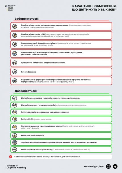 Нагадаємо, в Україні діє адаптивний карантин. С 8 березня червона зона карантину діє вже в чотирьох українських областях - Івано-Франківській, Чернівецькій, Закарпатській і Житомирській. Напередодні в червону зону включили місто Київ. У помаранчевої зоні - Вінницька, Донецька, Київська, Кіровоградська, Львівська, Миколаївська, Одеська, Сумська, Тернопільська, Херсонська, Хмельницька та Черкаська області. У зв'язку з ростом захворюваності в Києві та Львові ввели локдаун з 20 березня. З 21 березня обмеження посилюють в Київській області.