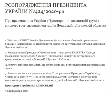 У четвер, 30 липня, президент України Володимир Зеленський прийняв остаточне рішення щодо того, хто буде представляти Україну в ТКГ по мирному врегулюванню ситуації в Донецькій і Луганській областях. Він підписав розпорядження, яким звільнив колишнього президента Леоніда Кучму від виконання обов'язків керівника української делегації в Тристоронній контактній групі, а на його місце призначив першого українського лідера Леоніда Кравчука. Про це повідомляє ONLINE.UA з посиланням на ОП.