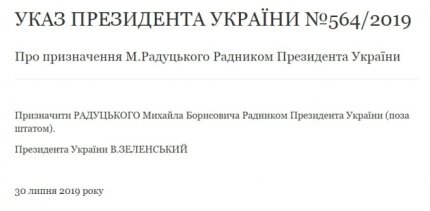 Президент Володимир Зеленський видав указ про призначення своїм радником засновника мережі клінік «Борис», колишнього заступника КМДА, новообраного народного депутата від партії «Слуга народу» Михайла Радуцького.