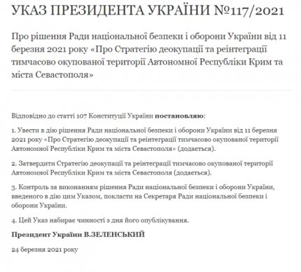 24 березня український глава Володимир Зеленський офіційно ввів в дію план РНБО по Криму. Глава української держави видав указ про затвердження стратегії, в якій визначено комплекс заходів дипломатичного, військового, економічного, інформаційного, гуманітарного та іншого характеру, спрямованих на відновлення територіальної цілісності, державного суверенітету України в міжнародно визнаних кордонах шляхом деокупації і реінтеграції Криму. Відповідний указ набрав чинності з сьогоднішнього дня. Про це повідомляє ONLINE.UA з посиланням на пресслужбу ОПУ.