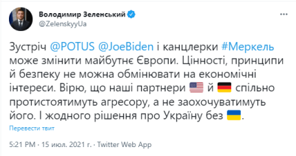 Зеленський вважає, що зустріч Байдена і Меркель може змінити майбутнє Європи. При цьому він вирішив нагадати лідерам США і Німеччини, що "цінності, принципи та безпеку не можна обмінювати на економічні інтереси". Зеленський розраховує на те, що Байден і Меркель приймуть остаточне рішення по "Північному потоку-2" на користь України.