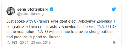 "Щойно розмовляв з новообраним президентом України Володимиром Зеленським. Я привітав його з перемогою і запросив його відвідати штаб НАТО в найближчому майбутньому. НАТО продовжуватиме надавати Україні сильну політичну та практичну підтримку", - сказано в повідомленні Столтенберга.