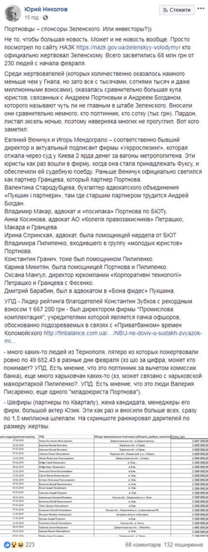 «Портновці - спонсори Зеленського. Або інвестори? Подивився по сайту НАЗК, хто офіційно жертвував Зеленському. Всього засвітилися 68 млн грн від 230 людей з початку лютого. Серед жертводавців, виявилася порівняно велика купа юристів, пов'язаних з Андрієм Портновим та Андрієм Богданом, якого називають чи не головним у штабі Зеленського. Вносили вони хто полтинник, хто сотку (тис. грн)», - повідомив Ніколов.